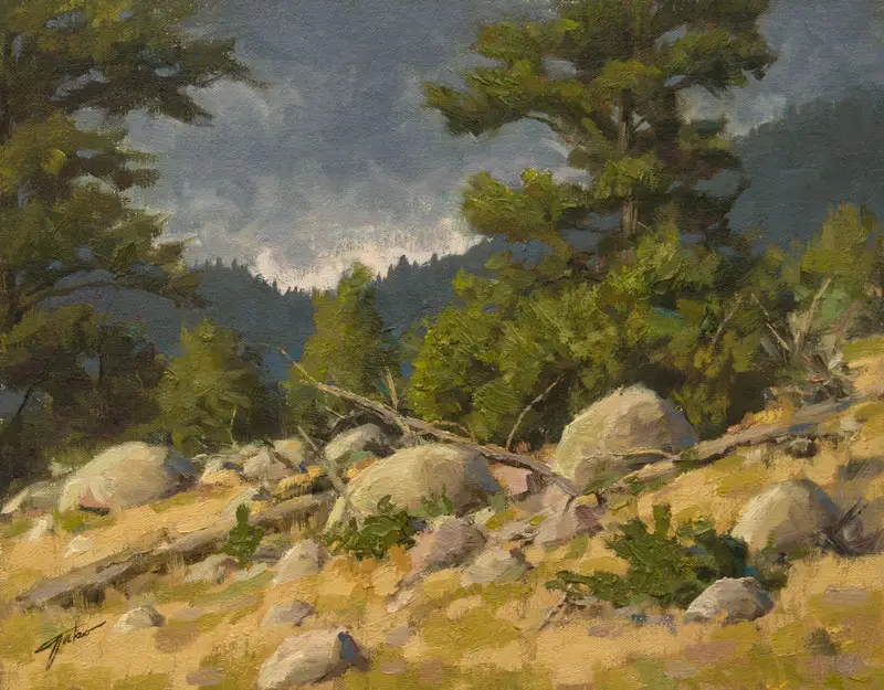 Sky holes are the openings we see in a mass of tree foliage that reveal the sky (or mountain, or other objects) that is behind the tree. So technically they are not always "sky holes" but that term is used to keep things succinct. Once again, the principle of diffraction applies here: the smaller the sky hole, the darker it is. This is because the smaller hole is surrounded by darker foliage and will therefore appear darker. If you use the exact same color and value for your sky holes as you did for the main part of the sky, these holes will look pasted on and not part of the scene.