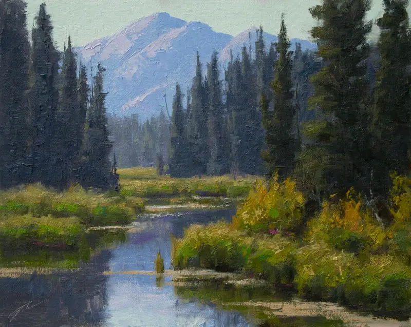 Painting diffraction can be easy when using a wet-on-wet paint application method. If you have already painted your sky and that color is still wet, you can take some of the tree color and carefully drag it into the wet sky color to lighten it. You can also add some of the sky color to the tree color on your palette and lighten it before you add it onto your canvas.