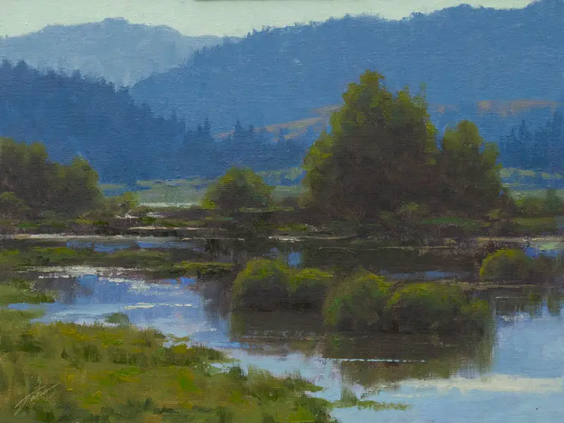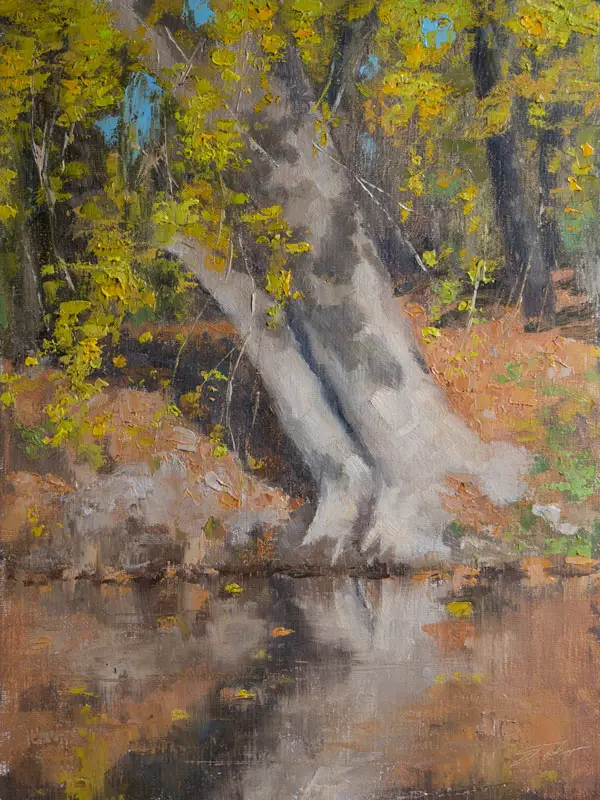 Summer trees are also affected by diffraction, though usually not as much. Small leaves or smaller groupings of foliage on a tree may be slightly lighter in value than the main mass of foliage. Many artists make the mistake of painting their defoliated trees the exact same value from trunk to twig, which gives their trees an artificial, pasted-on appearance. Look for diffraction in nature and paint it accordingly and this problem will be solved.