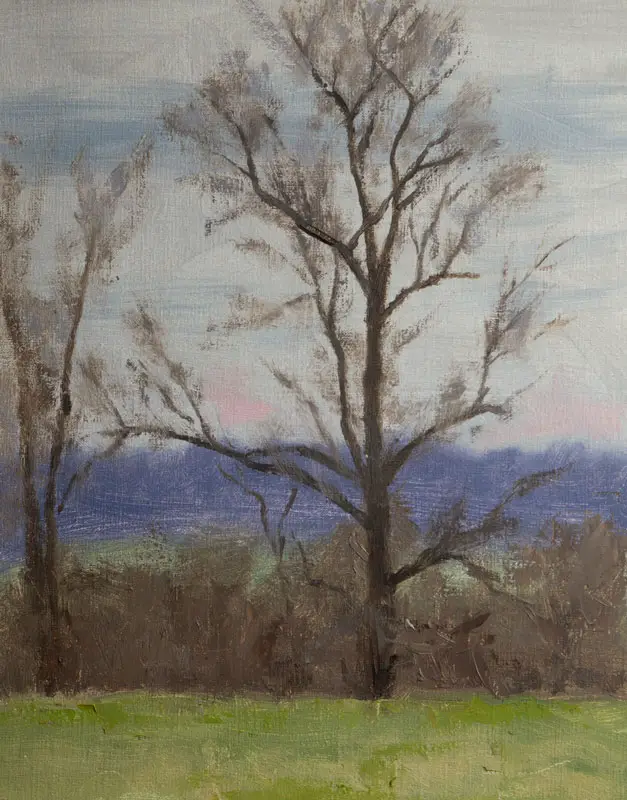 As children, we painted our tree trunks and branches brown. In reality, they are usually more gray than anything else. Most of the time a warm gray, but gray nonetheless. This gray is elusive and can even be on the cool side in certain situations.