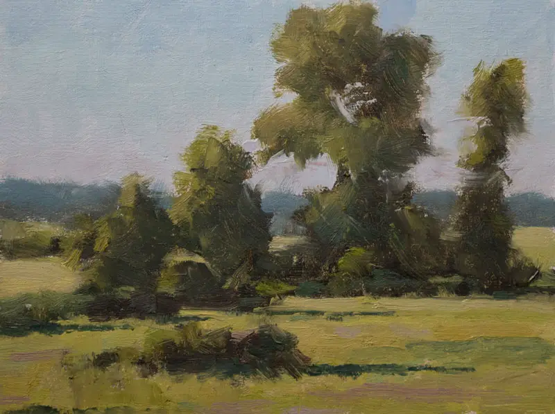 Many artists have this reversed. Just go look at a Bob Ross painting class at your local chain art store. You will see paintings where the artist made the sky a very dark blue and used straight Cadmium Lemon for the sunlit part of the trees. While the fan brush may have created some nifty texture, their trees do not look realistic. The sky should be very light and the highlights on the trees much darker. (see my video on The Biggest Tree Painting Mistakes and How to Fix Them to see this concept demonstrated.)